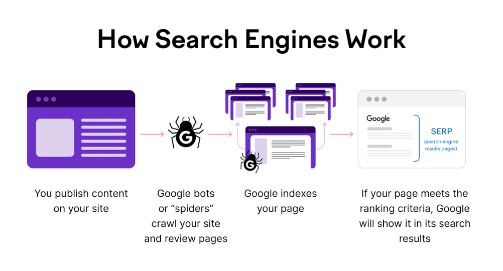 • Crawl – Search engines use web crawler “spiders” or “bots” to crawl and explore your website to discover new or updated pages. They follow hyperlinks, also known as internal links, to find additional pages.